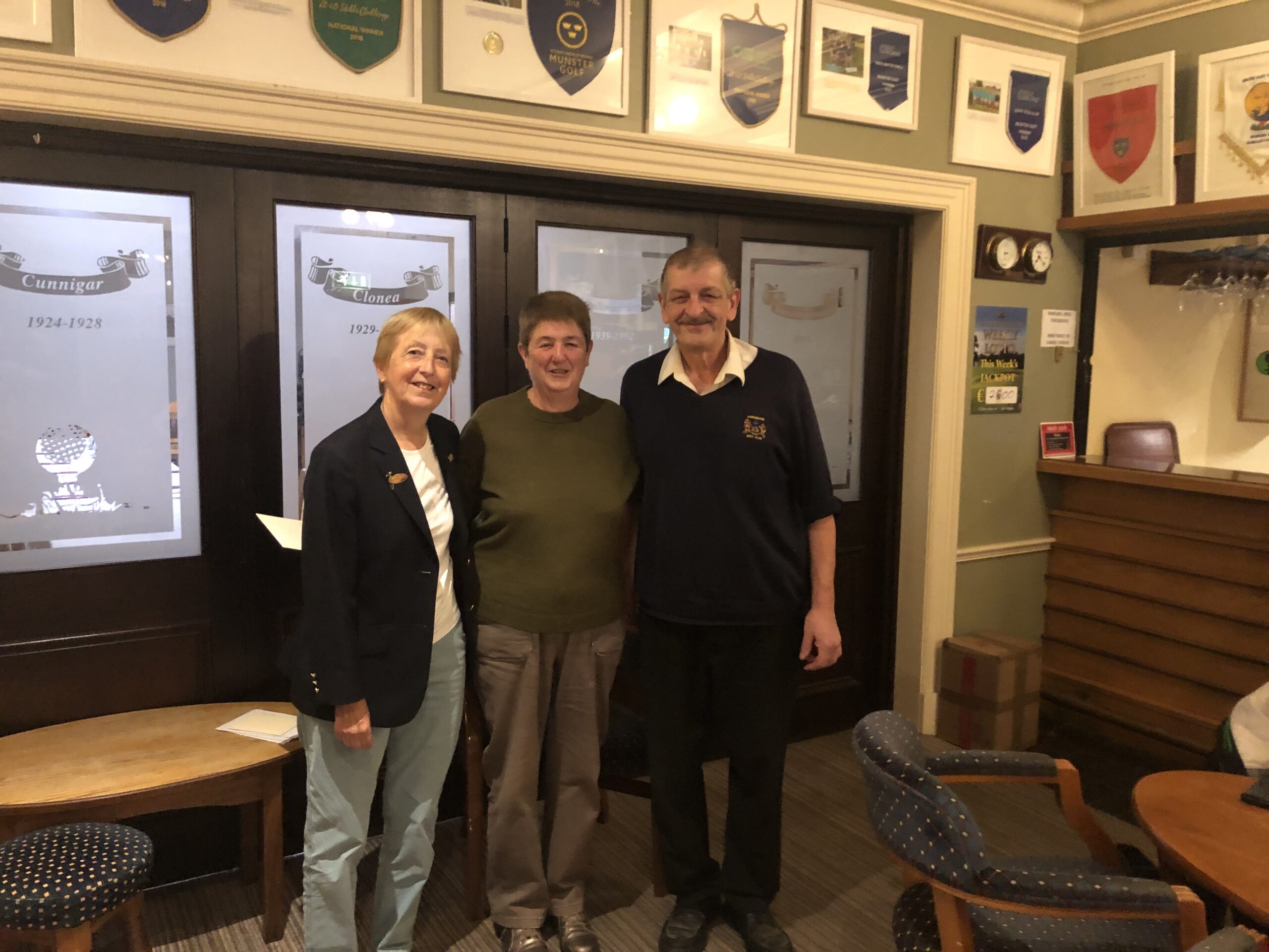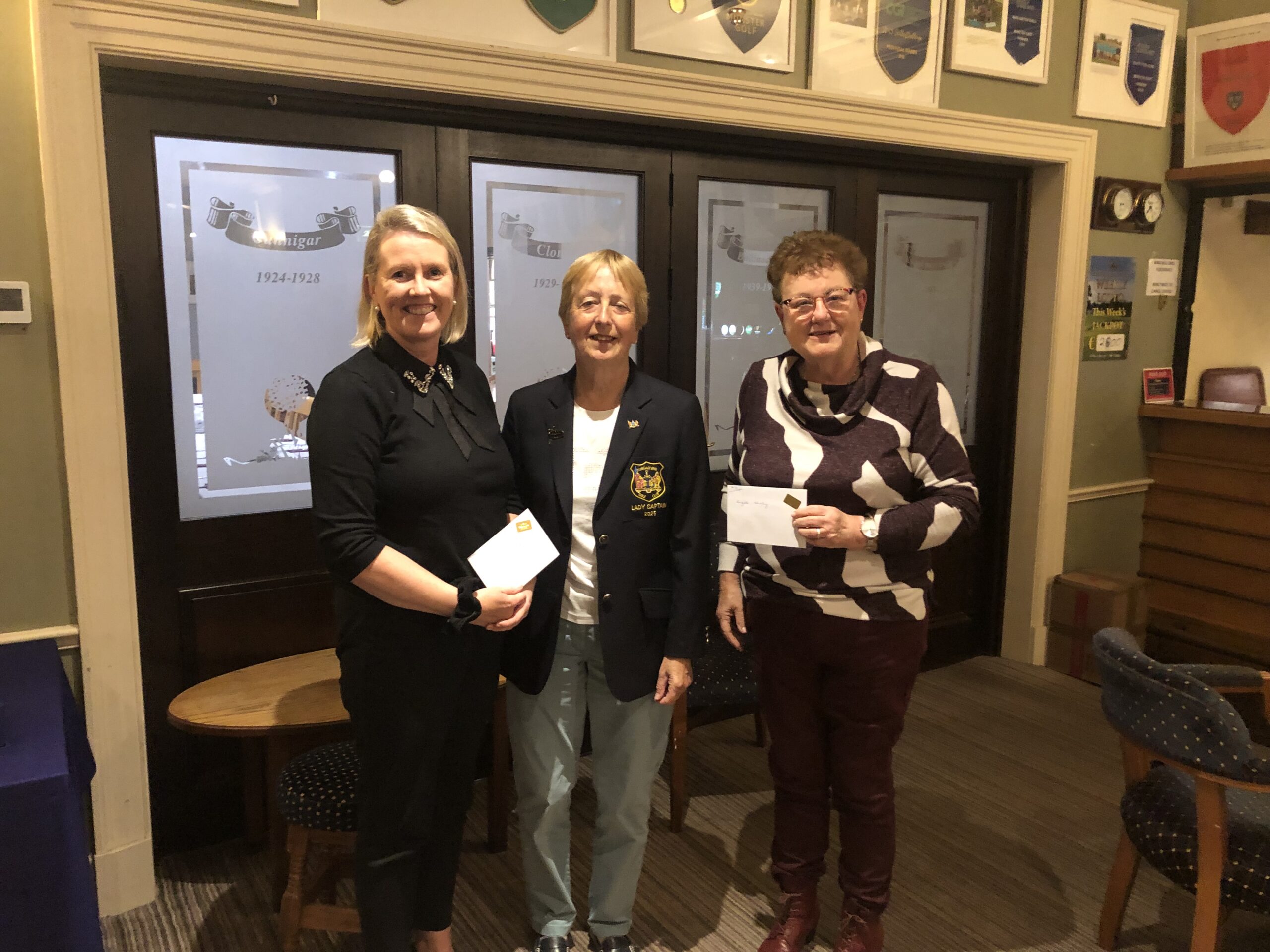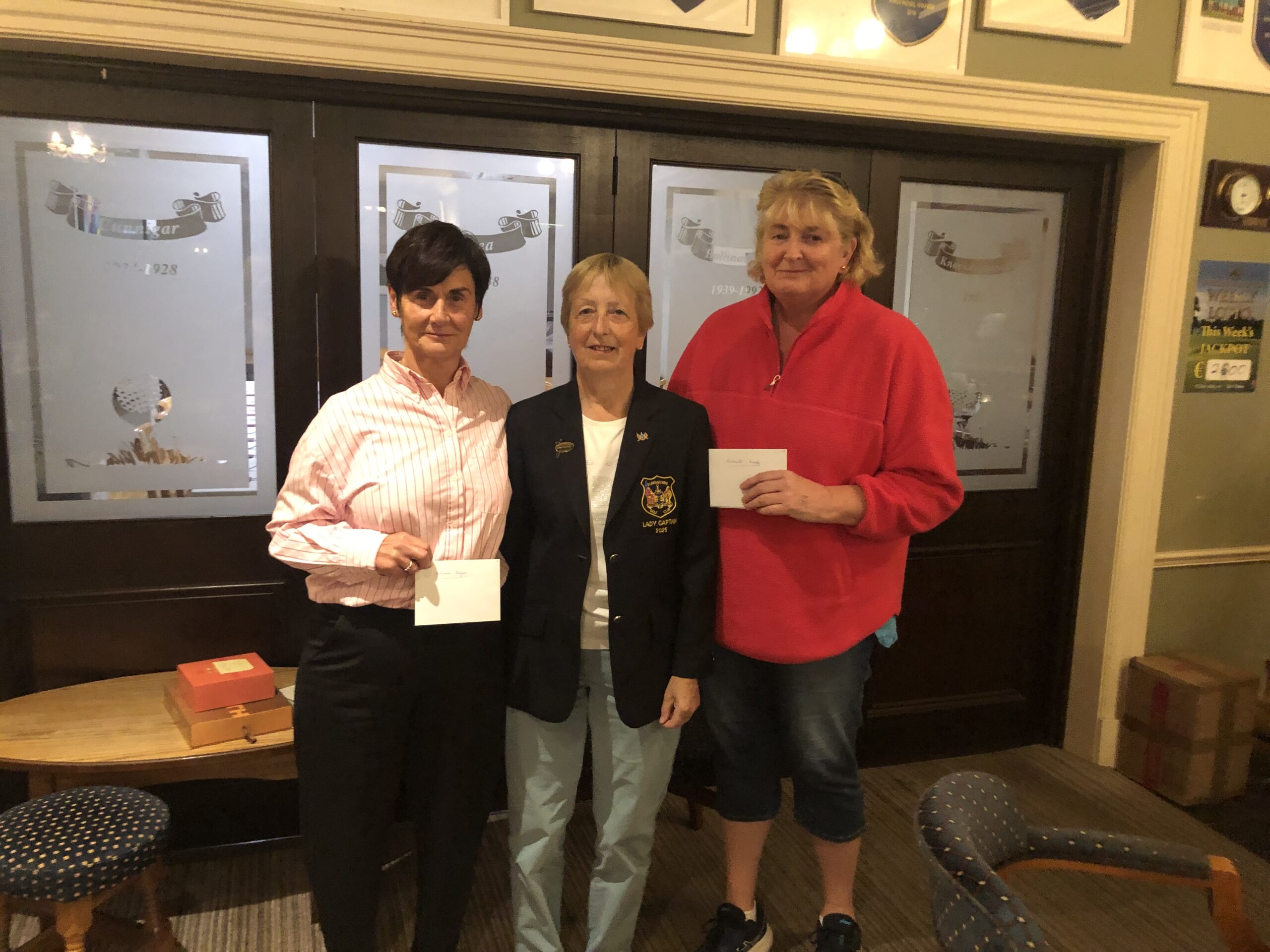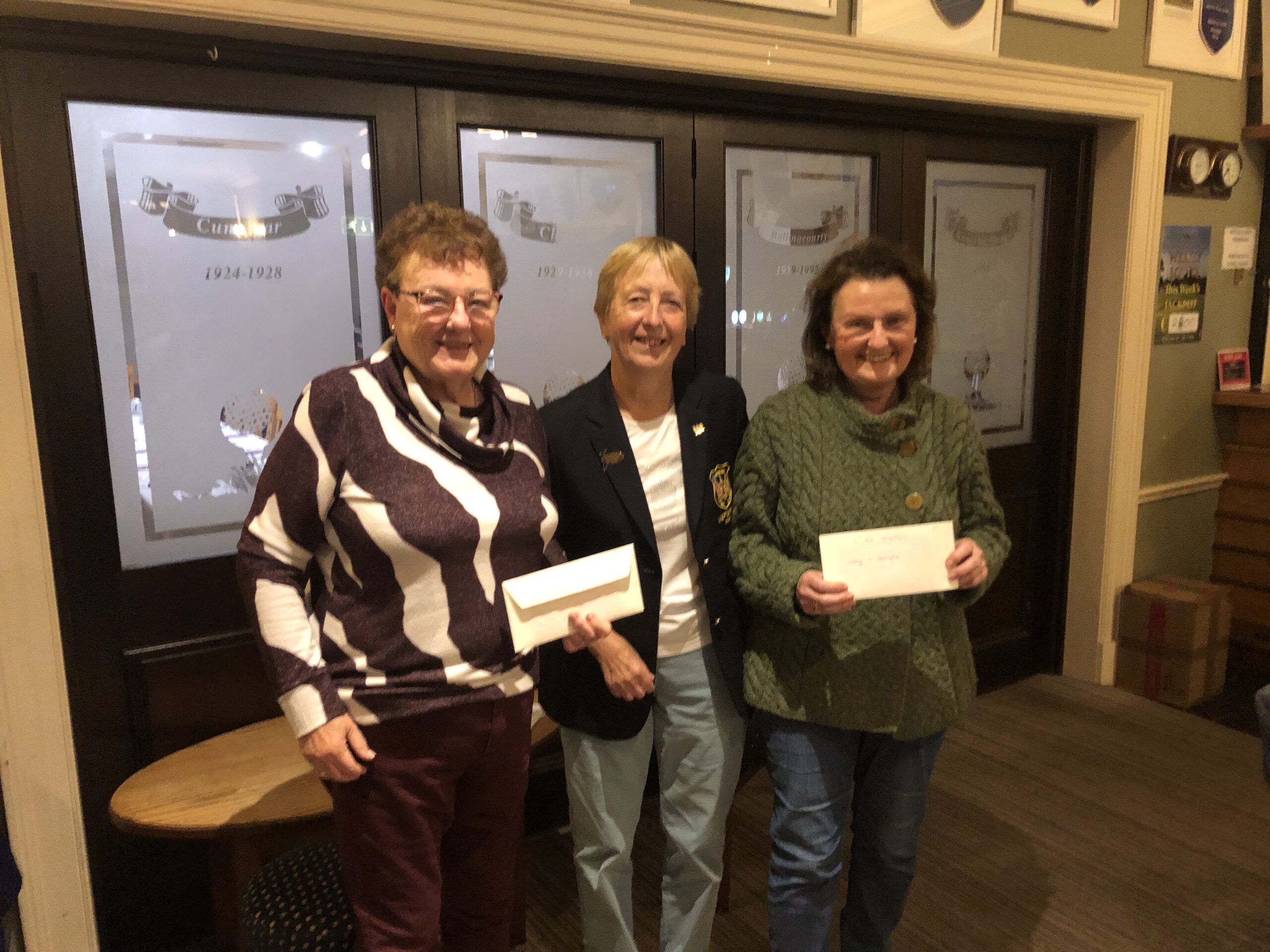 Winners of competition September 19/20 sponsored by Baumann Jewellers. Cathie O'Mahoney 2nd, Bernie Lynch Lady Captain, Angela Murphy 1st
