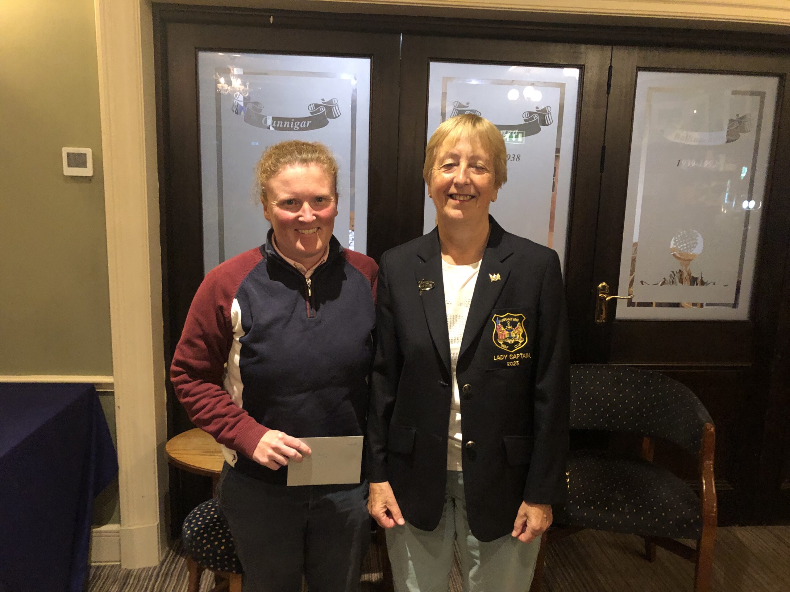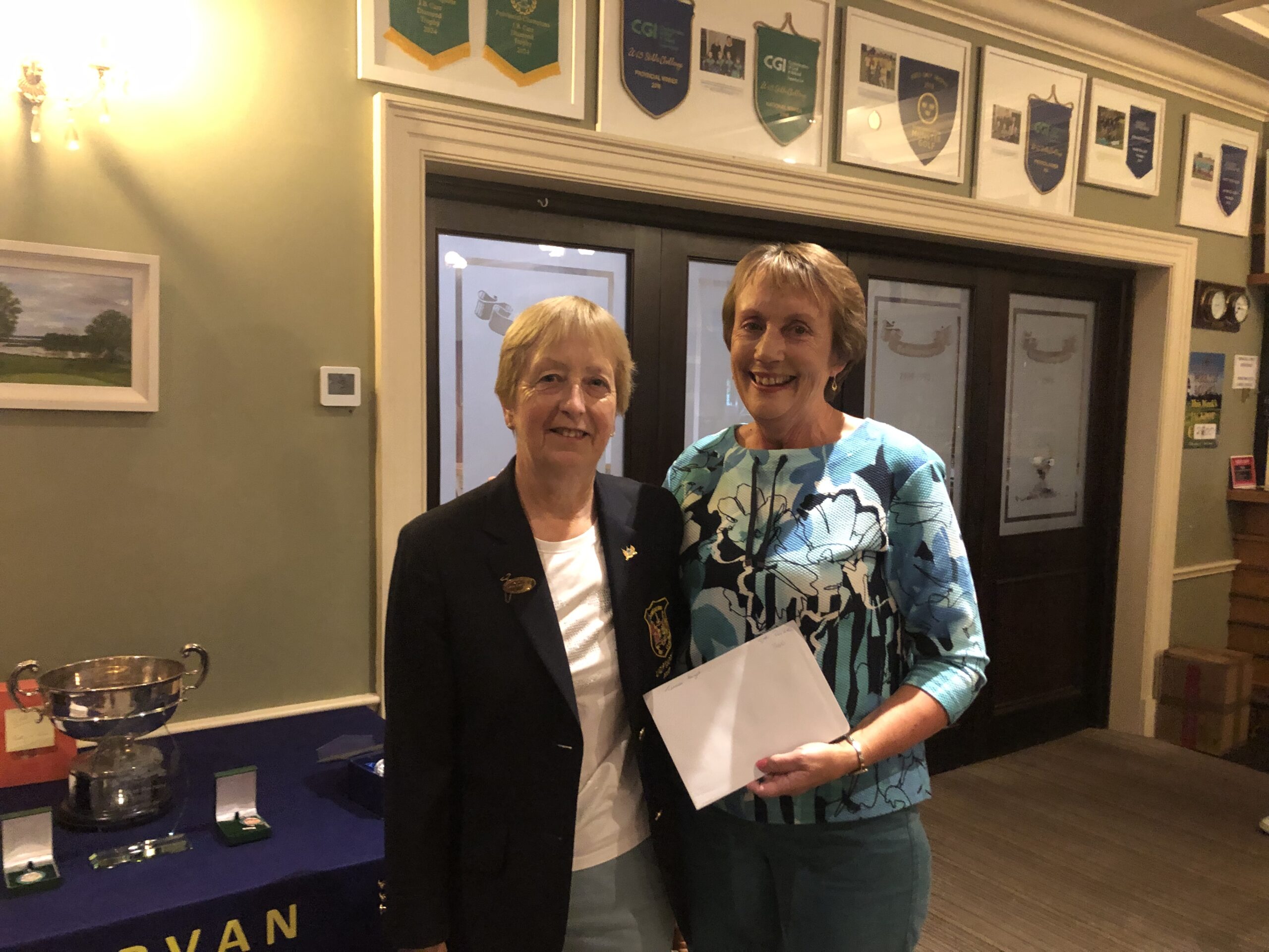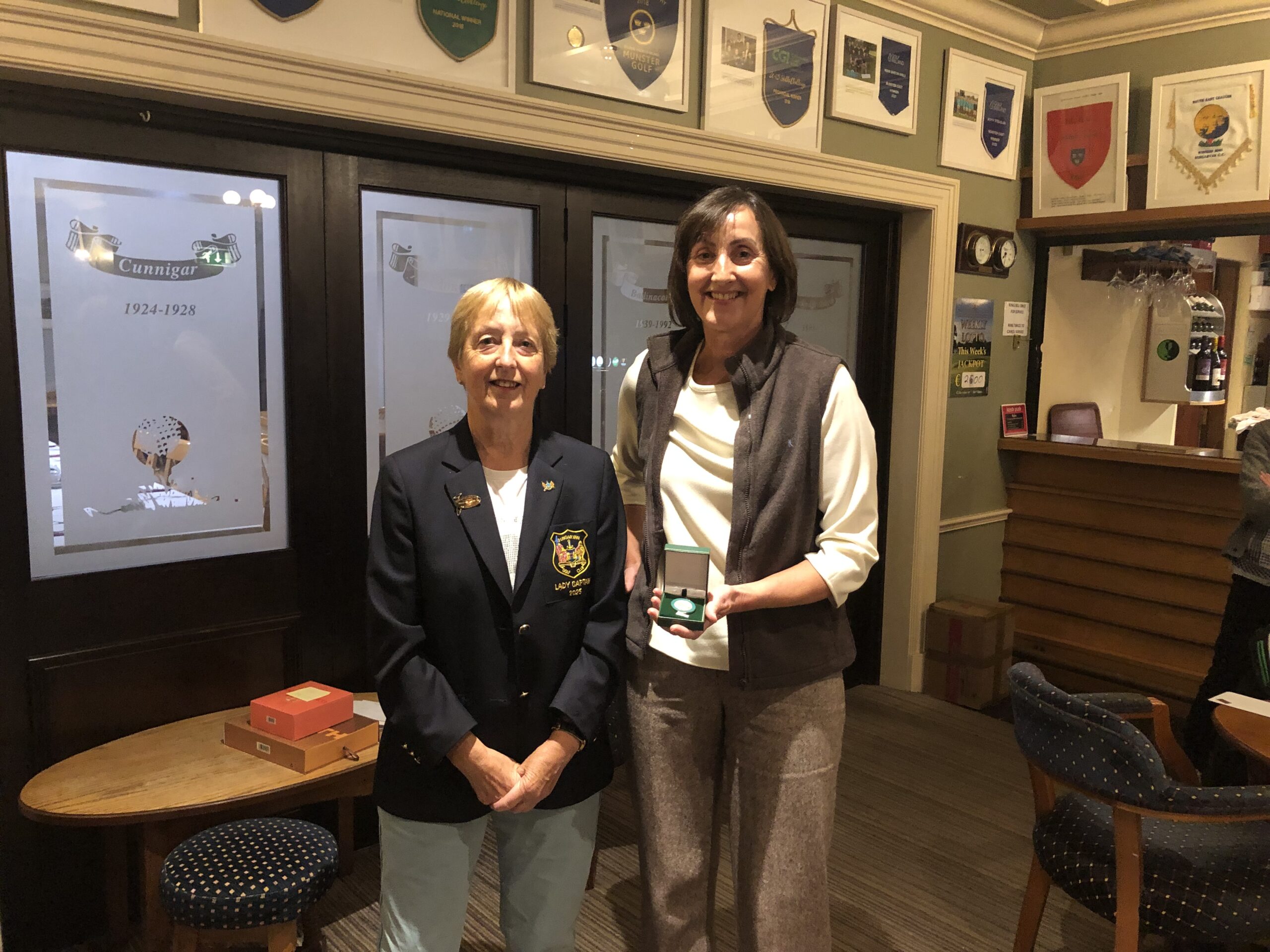 Presentation of award for a 'Hole in One' 29th July, 5th hole. Lady Captain Bernie Lynch, Cathie O'Mahoney.