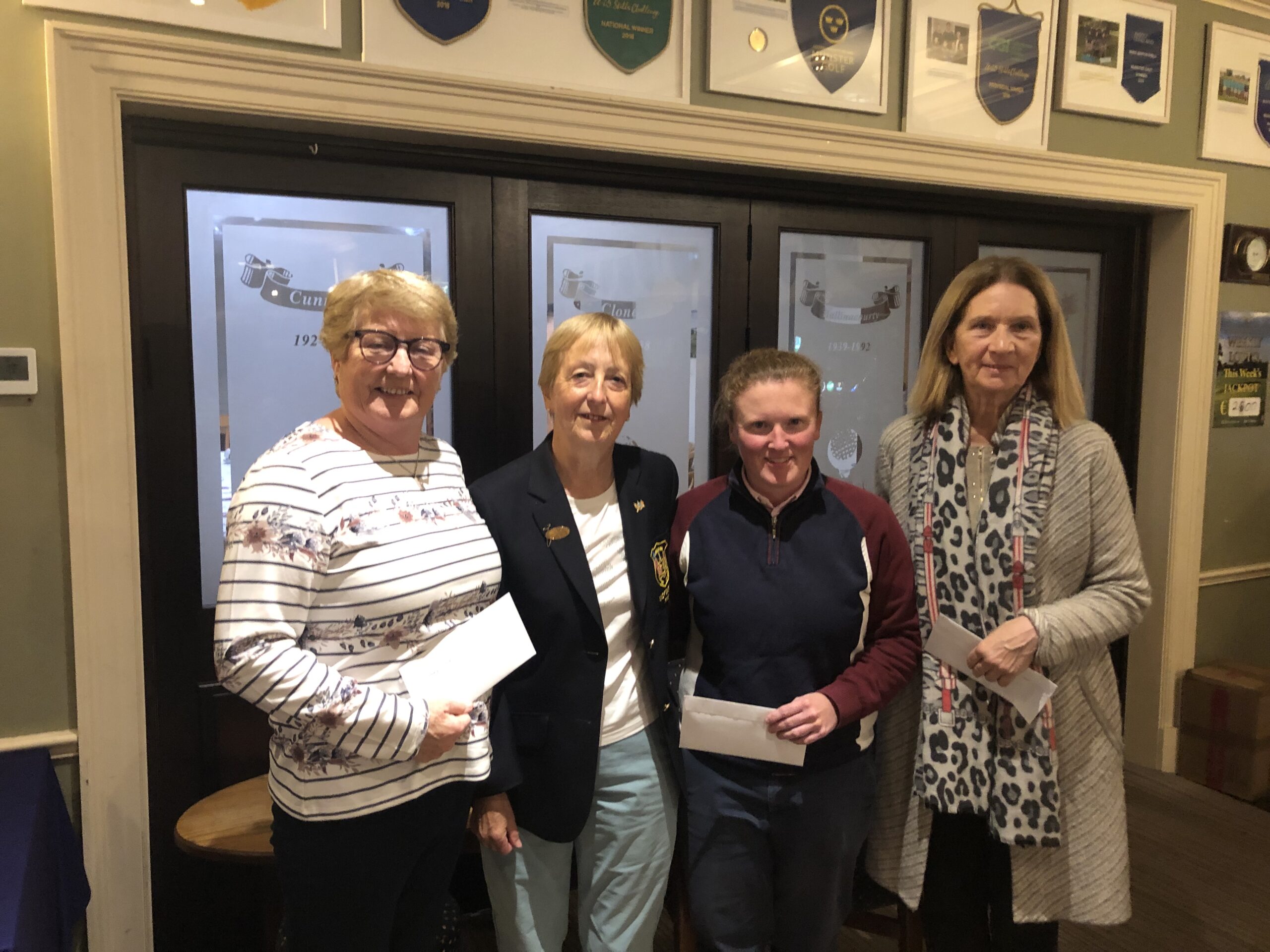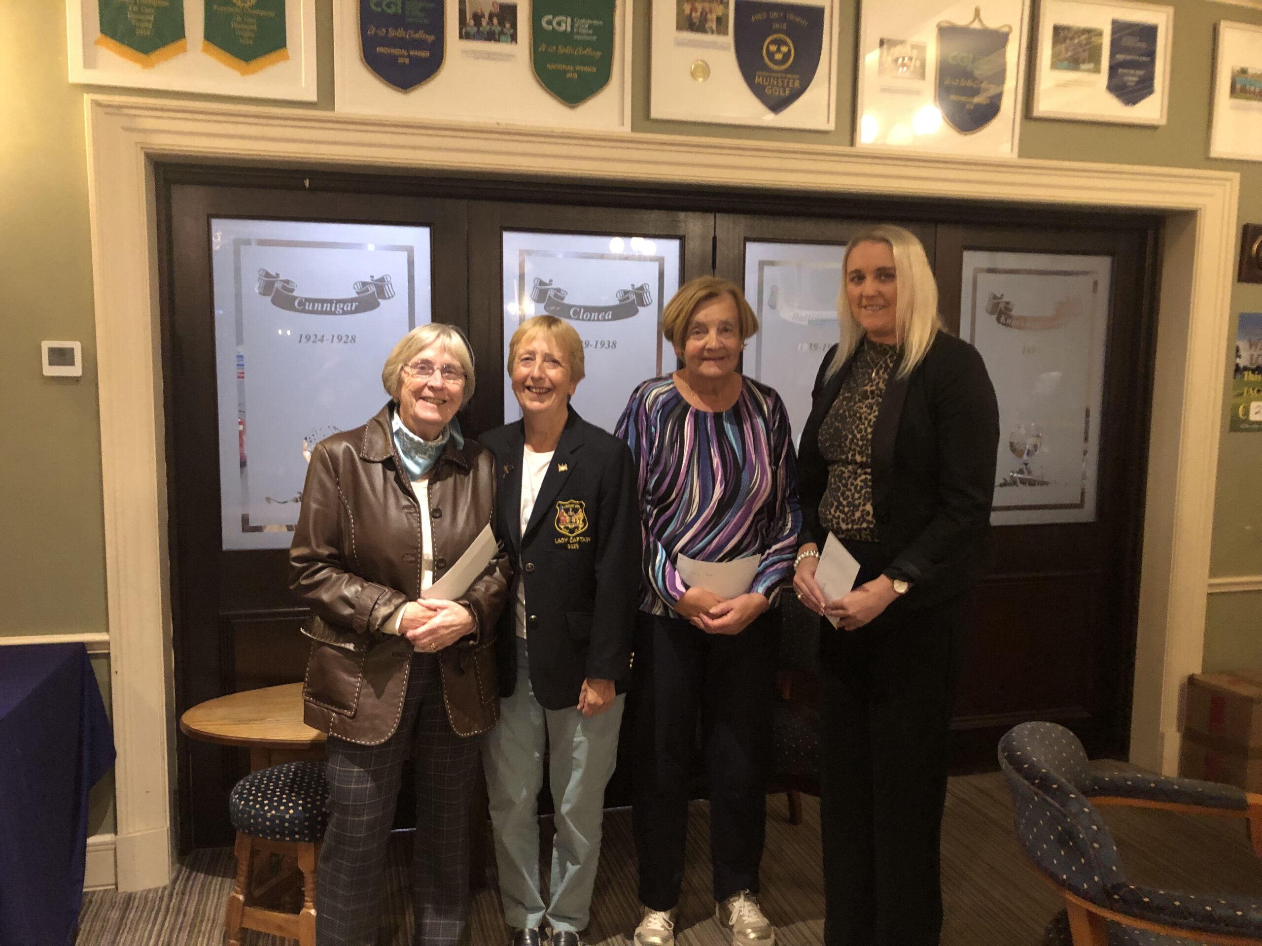 Lady Captain Bernie Lynch presented prizes for competition 22/23 August sponsored by Ballinacourty Produce. Betty O'Mahony 3rd, Bernie Lynch, Mary Phelan 2nd, Linda Buckley 1st.