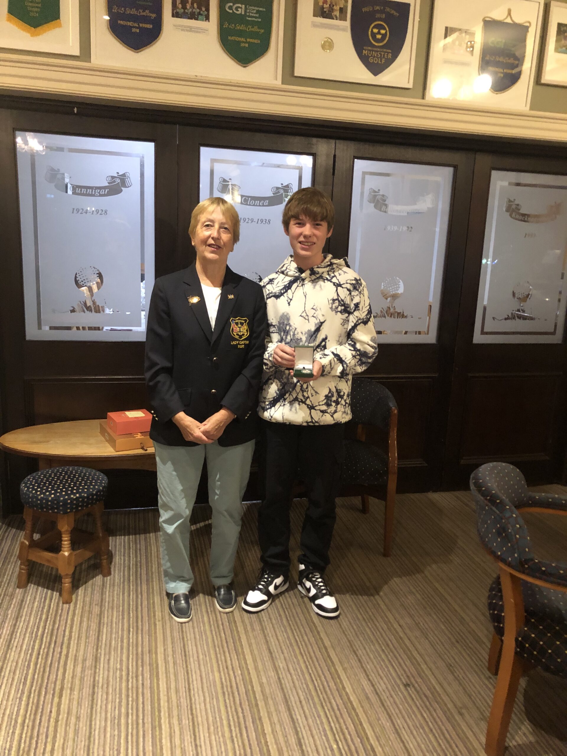 Presentation of Silver Medal won by Maisie Breen for Dungarvan Golf Club. Lady Captain Bernie Lynch, Donnacha Breen accepted for his sister.
