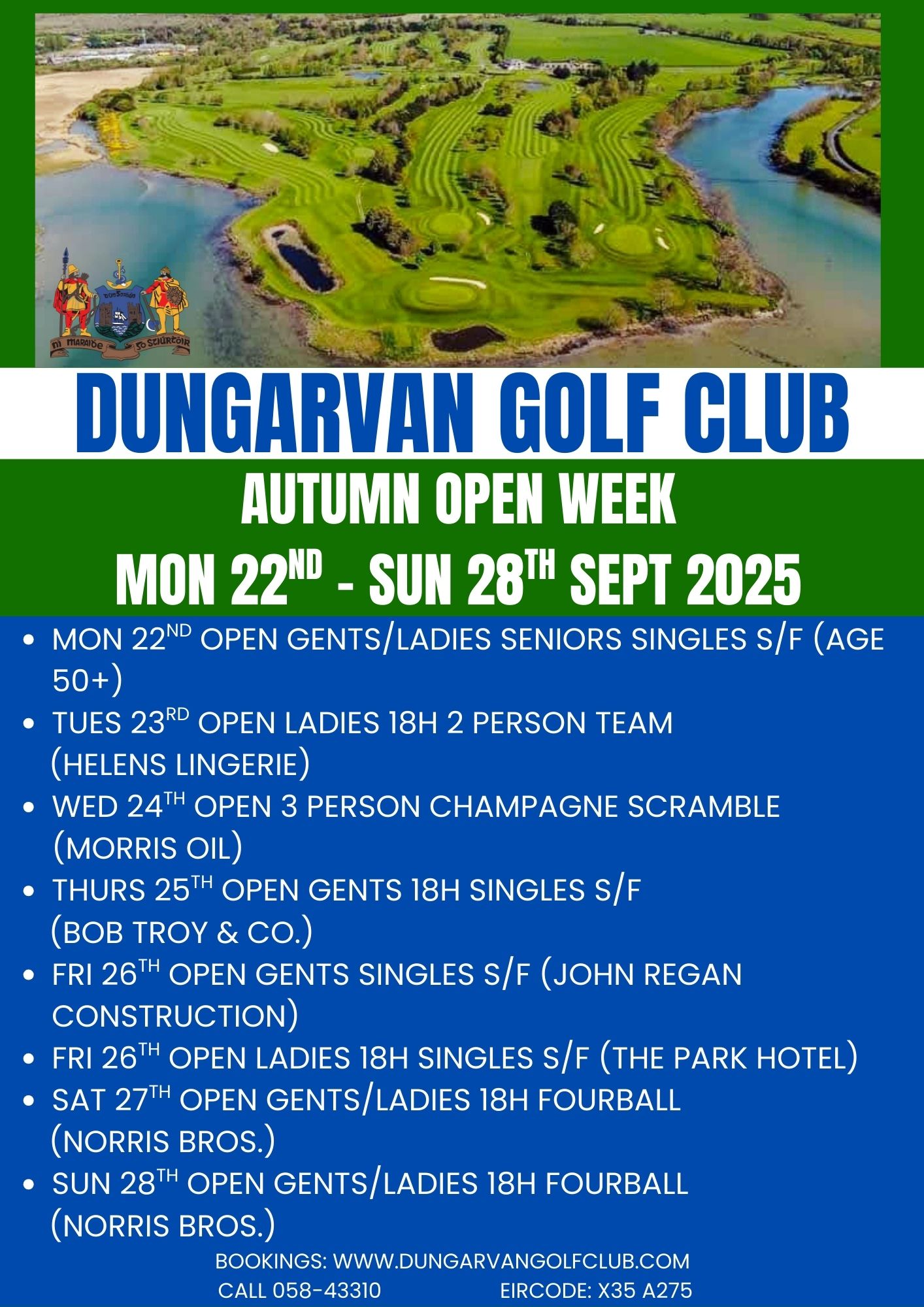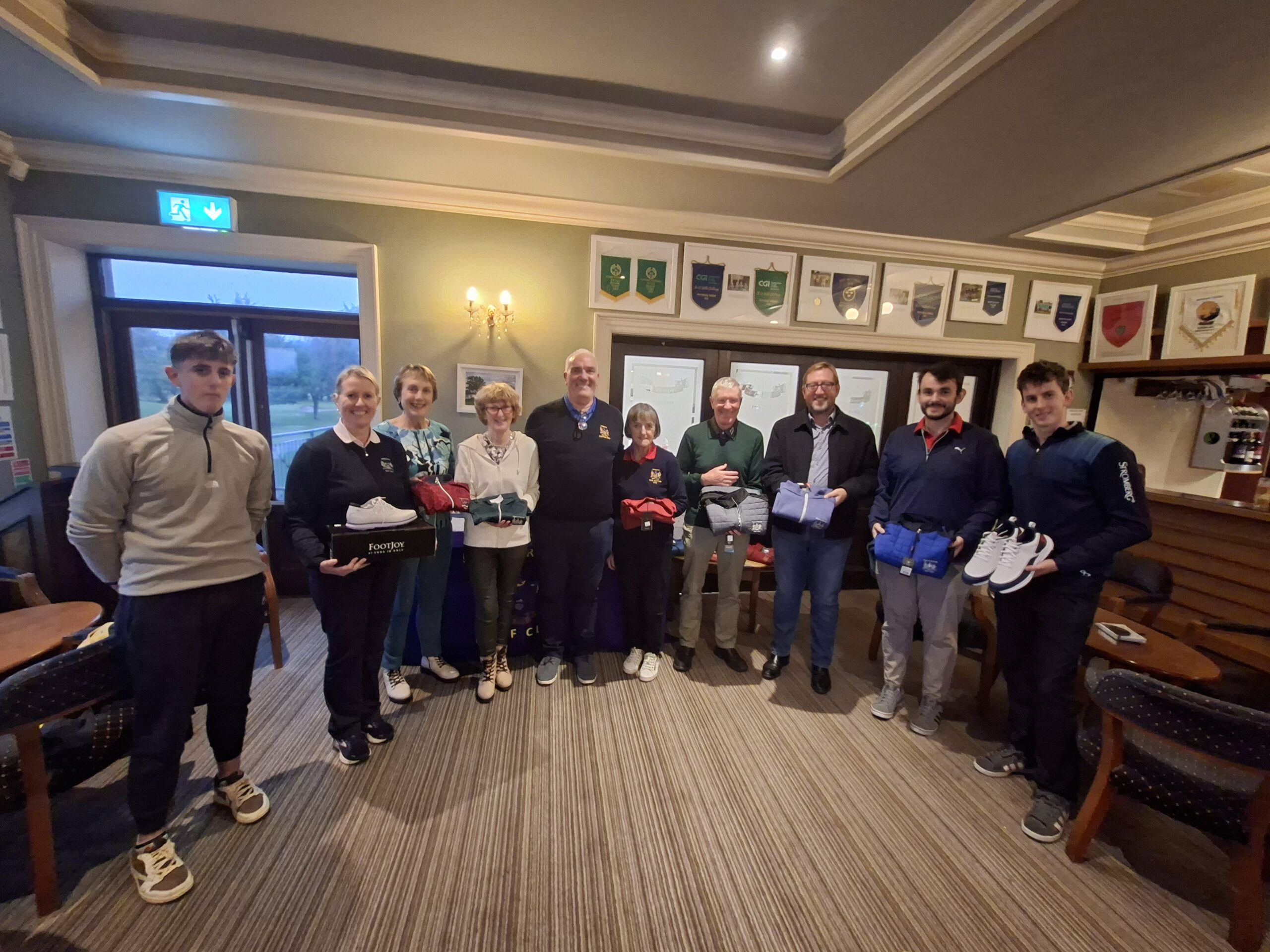 Pictured at the Presentation of Prizes kindly sponsored by Bob Troy & Co/Husqvarna are winners of our Monday and Thursday Open Week competitions: Edward Moynihan, Captain, Colin Troy (Sponsors), Ann Moloney (on behalf of John T. Moloney 1st), Gary Byrne 1st, Jamie Ryan 2nd and Martin T. Landers on behalf of Brian Dillon 2nd.